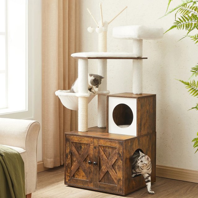 • 2-in-1 Design: A cat tree and litter box enclosure in one compact unit, saving space without sacrificing functionality.