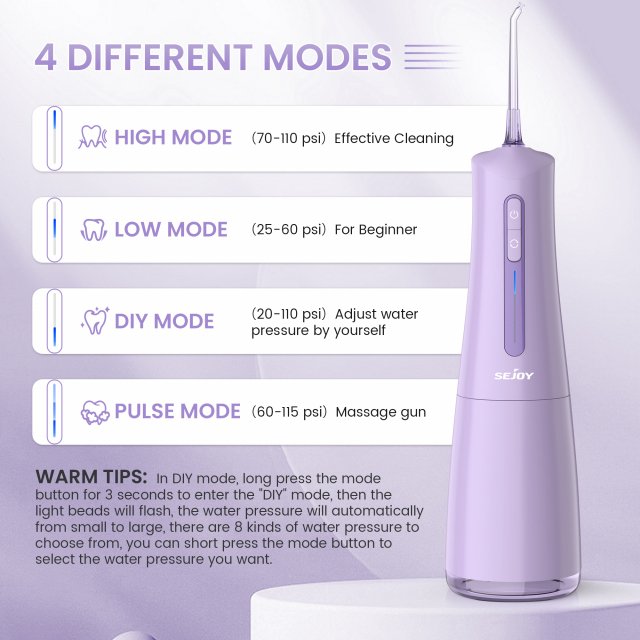 This professional dental water flosser offers 4 cleaning modes—Low, High, Pulse, and DIY—to suit sensitive gums or provide a deep, invigorating clean. Equipped with 6 interchangeable spray nozzles, it ensures the perfect fit for every user and cleaning style. The removable 10.1 oz (300 ml) water tank is easy to fill and clean, preventing buildup and keeping your device fresh. With an IPX7 waterproof design, you can safely use it even in the shower.