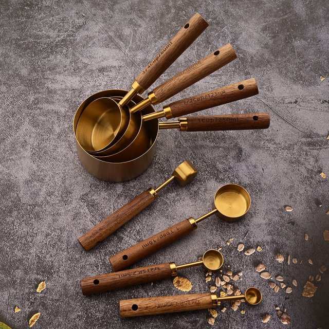 Gold Wooden Handle Stainless Steel Measuring Cups and Spoons Set