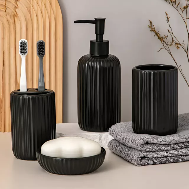 Give your bathroom a fresh, elegant touch with this stunning 4-piece Black Stripe Ceramic Bathroom Accessory Set. Designed with a minimalist black-and-white striped pattern, this set adds a refined aesthetic while keeping your essentials perfectly organized. Whether you’re upgrading your home, furnishing a guest bathroom, or looking for a hotel-style finish, this chic ceramic set is the perfect solution for elevating your space effortlessly.