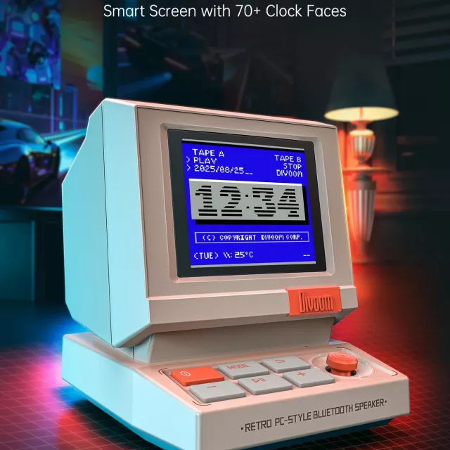 More than a speaker, it’s your tiny personal assistant. Use it as a clock, set alarms, run timers, or get reminders—all from one compact device. With its charming retro PC look, it’s the perfect addition to your nightstand, home office, or gaming corner. Powered by a long-lasting 5000 mAh battery, it keeps the music going for up to 8 hours on a single charge.